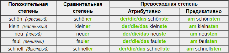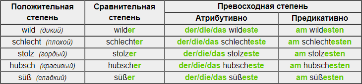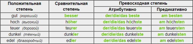 | Примечания: ► При сравнении двух существительных многие немцы ошибочно употребляют союз <wie>, некоторые даже говорят « → Maria ist schöner als Petra. (Мария красивее, чем Петра.) ► Славяне, начинающие изучать немецкий язык, часто склонны трактовать предикативное употребление как атрибутивное и добавляют окончание, соответствующее существительному. Запомните: → Das Mädchen ist Sie ist ein schönes Mädchen. (= ссылается на существительное) Das Mädchen ist schön. (= ссылается на глагол) ► Существует ряд прилагательных, которые выражают свойства/состояния, которые нельзя сравнивать в разных степенях, либо они сами по себе выражают самую высокую степень сравнения. Их, соответственно, не сравнивают, разве что, в переносном смысле: → falsch (неправильный), rund (круглый), tot (мёртвый), leer (пустой), fertig (готовый), schwanger (беременный), schriftlich (письменный), blind (слепой) → maximal (максимальный), total (тотальный), einzig (единственный) ► Формы сравнительной степени и формы атрибутивного употребления в превосходной степени склоняются таким же образом, как и прилагательные положительной степени: → Er hat einen schönen Namen. ~ Er hat einen schöneren Namen. ~ Er hat den schönsten Namen. |