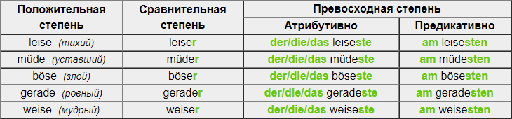 У некоторых прилагательных гласная буква в формах других степеней становится умлаутом. Чаще всего речь идёт об односложных прилагательных, которые описывают человека: